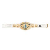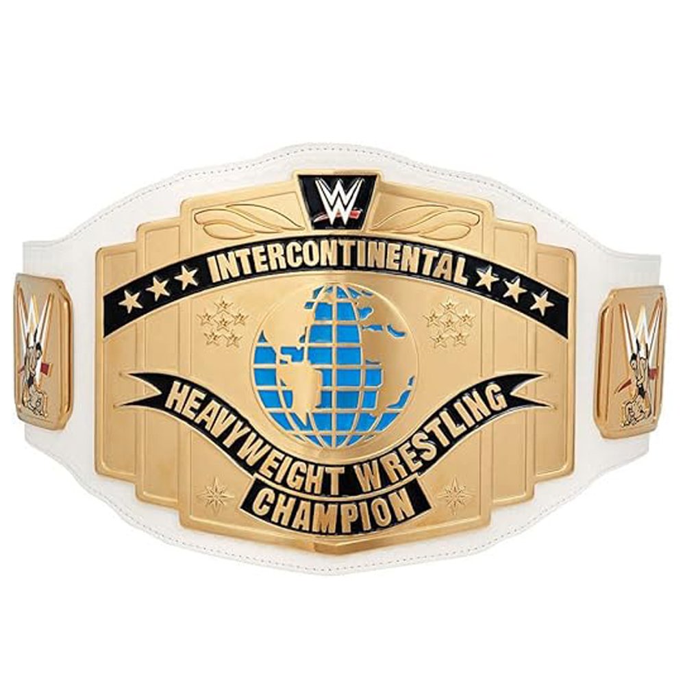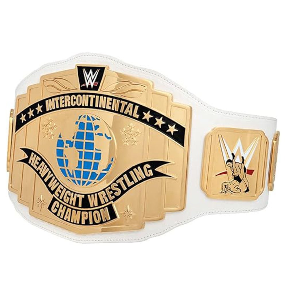 - A White Intercontinental Championship belt is a replica of the professional wrestling title, notable for its white leather strap that contrasts with the gold-plated medallions and plates. These belts are often made with brass or zinc metal plates, designed to mirror the authentic championship seen in WWE events, and feature detailed engravings and iconography. They are popular collectibles for fans, often available in various sizes from full-size replicas to smaller versions for display or play.